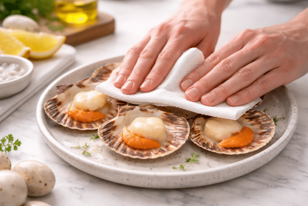 Tampona bene le capesante con carta da cucina per eliminare l’acqua in eccesso.