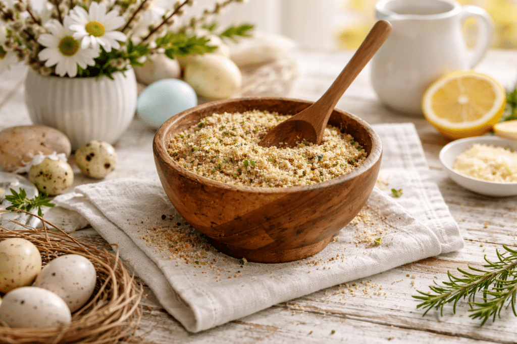 In una ciotola unisci pangrattato, scorza di limone, aglio tritato finissimo, prezzemolo e timo. Aggiungi un filo d’olio fino a ottenere una sabbiatura umida.