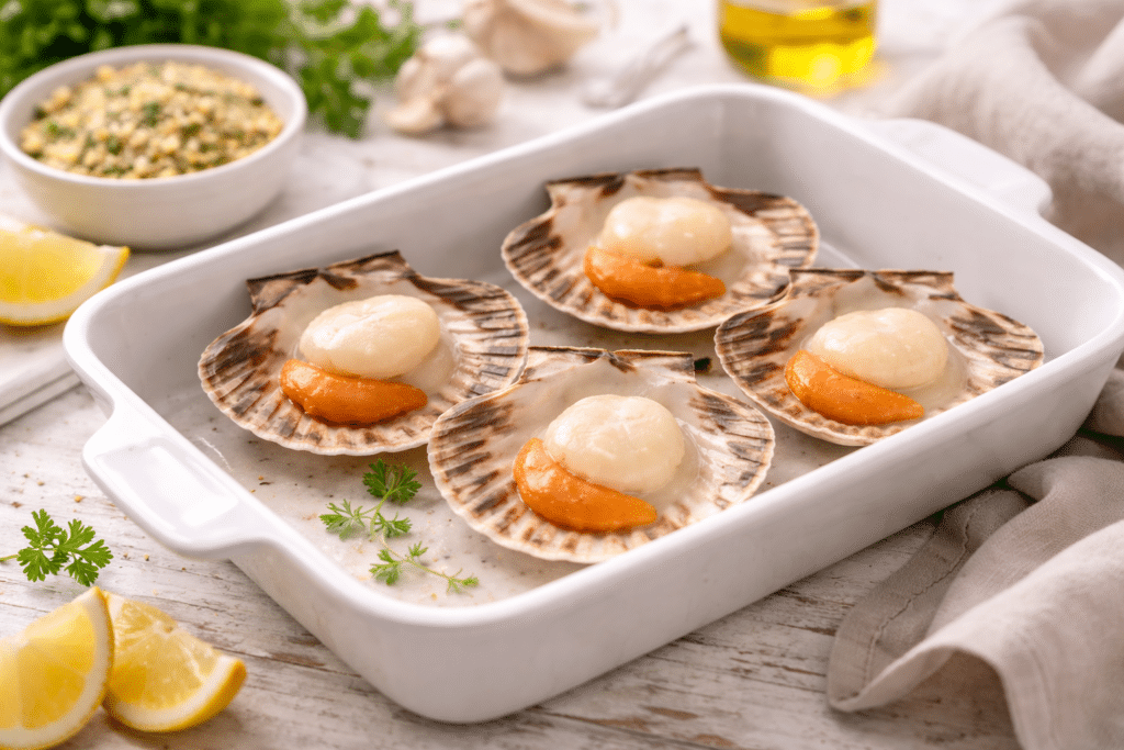 Disponi le capesante in una pirofila chiara leggermente oliata e aggiungi pochissimo sale e pepe.