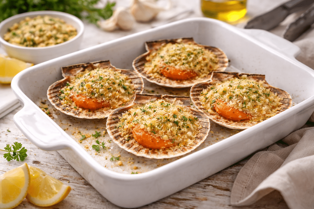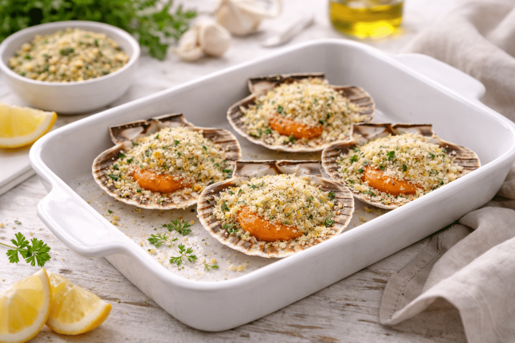 Distribuisci la panatura sopra ogni capasanta senza schiacciare.