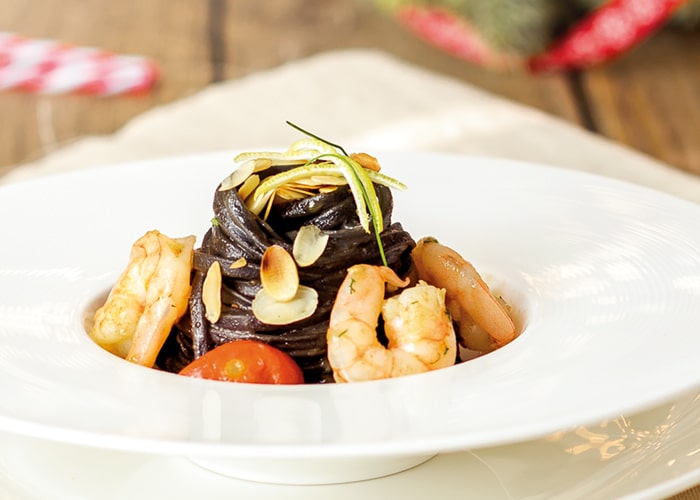 Linguine al nero di seppia con mazzancolla, pomodorini confit e mandorle tostate