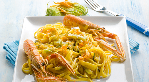 Tagliatelle con zucchine, scampi e fiori di zucca in padella