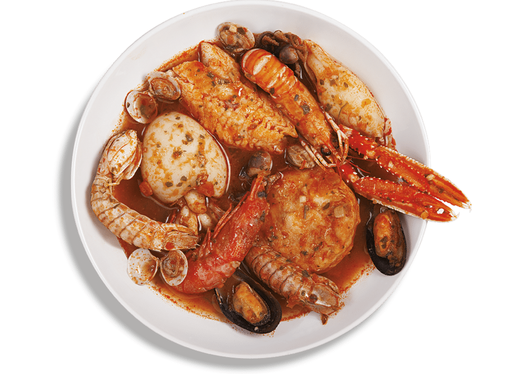 Tipica zuppa a base di pesce, ricca di calamaro, totano, mazzancolle, cozze, gamberi, vongole in una saporita salsa al pomodoro.