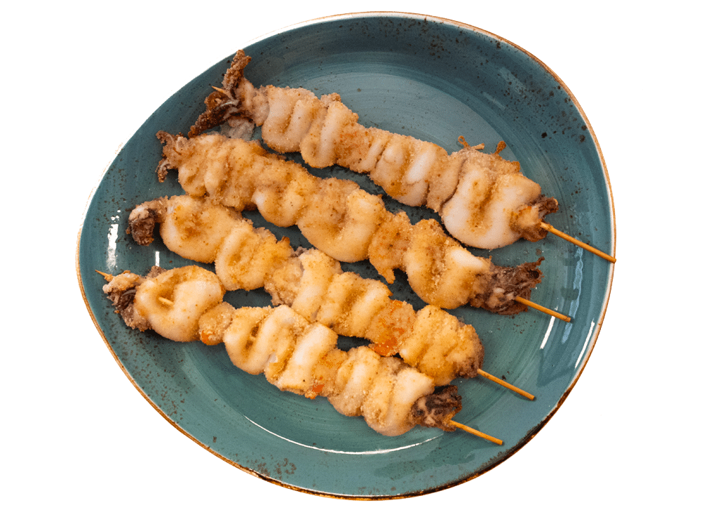Spiedini a base di calamari tagliati e puliti e mazzancolle.
