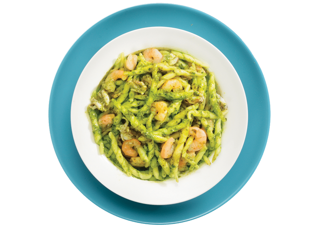 Piatto regionale che arriva dalla Liguria, la peculiare forma arricciata delle trofie trattiene perfettamente il pesto per un primo delizioso e dall’intenso profumo di mare. Ingredienti: Trofie, salsa al pesto, brodo di vongole, gambero sgusciato e scottato, vongola sgusciata, ciuffi di calamaro.