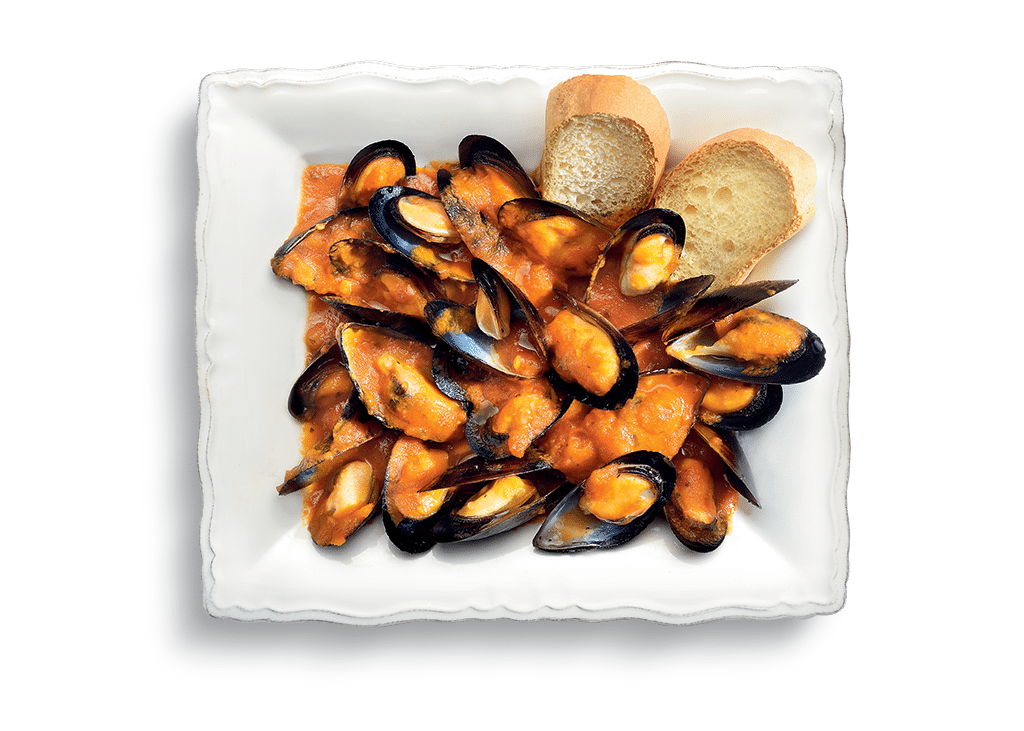 Una ricetta della tradizione marinara. Gustose cozze alla tarantina in salsa al pomodoro aromatizzate con cipolla e spezie, da servire caldo e accompagnato con crostini di pane tostato.