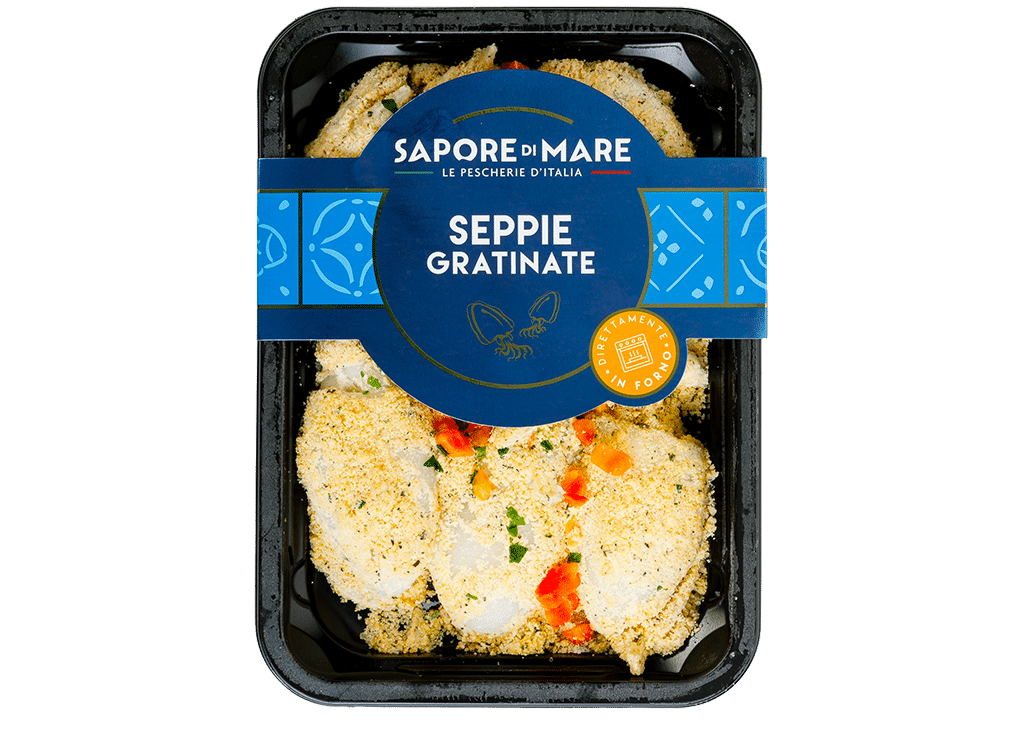 Seppie gratinate già pronte da cuocere in forno fino a completa doratura: un gustoso antipasto caldo o secondo di pesce, in cui la delicatezza della seppia incontra la croccantezza della panatura.
