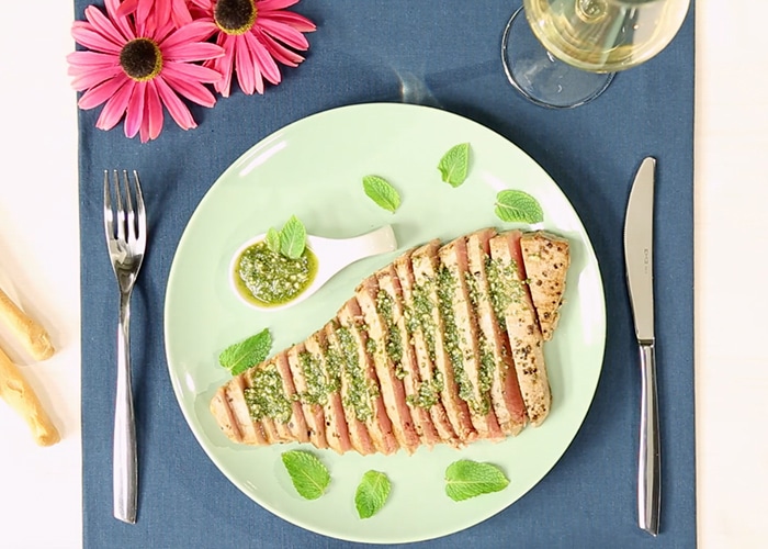 Lascia scongelare i tranci di tonno per una notte in frigorifero. Prepara una marinatura in cui far riposare il tonno con erba cipollina tritata, olio, il succo del lime, sale e pepe. Prepara il pesto tritando la menta con pinoli, olio e sale. Cuoci il tonno su una padella antiaderente circa 2 minuti per lato. […]