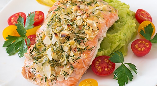 Salmone gratinato in crosta di mandorle e pure verde