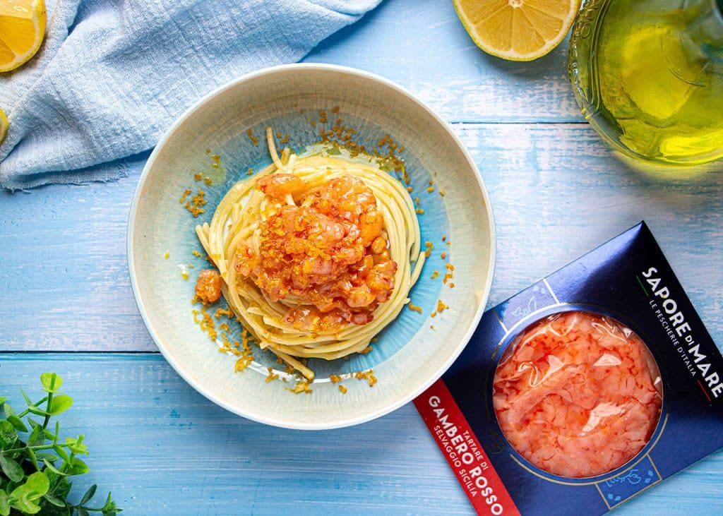 - SPAGHETTI CON TARTARE DI GAMBERI ROSSI E BOTTARGA DI MUGGINE