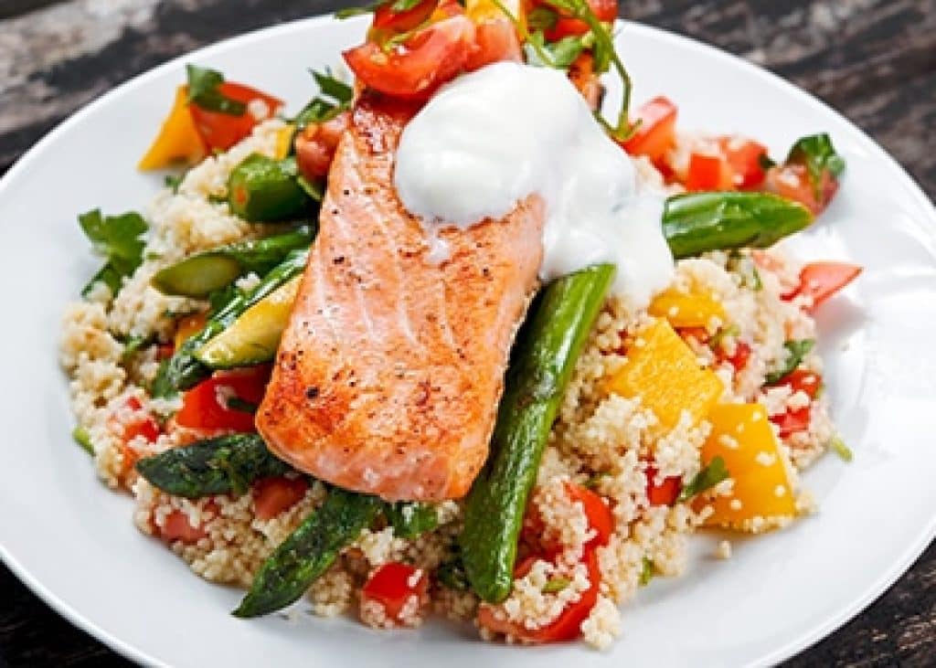 Salmone grigliato e cous cous colorato di verdure si incontrano in un piatto completo e armonioso. Leggero ma pieno di sapore, è l’esempio perfetto di come il benessere possa avere il profumo del Mediterraneo.