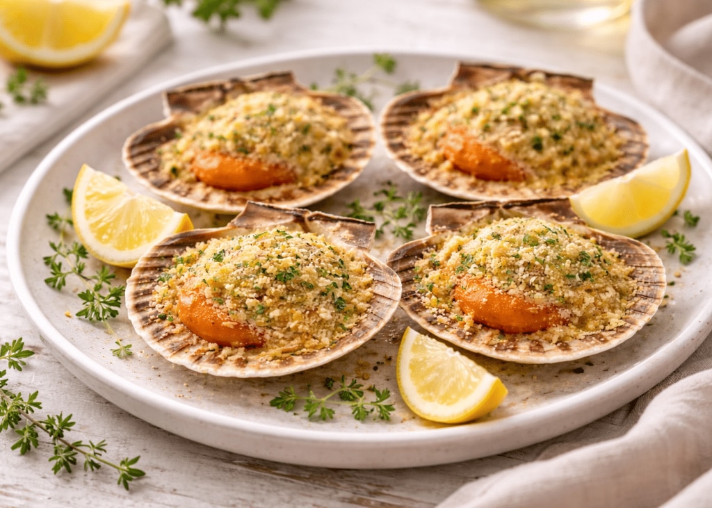 Un piatto elegante e sorprendentemente semplice da preparare che profuma di mare e di primavera. Le capesante, arricchite da una panatura profumata al limone e timo, si gratinano in forno fino a ottenere una superficie dorata e fragrante. Il risultato è un piatto leggero e raffinato che richiede pochissimo tempo di preparazione.