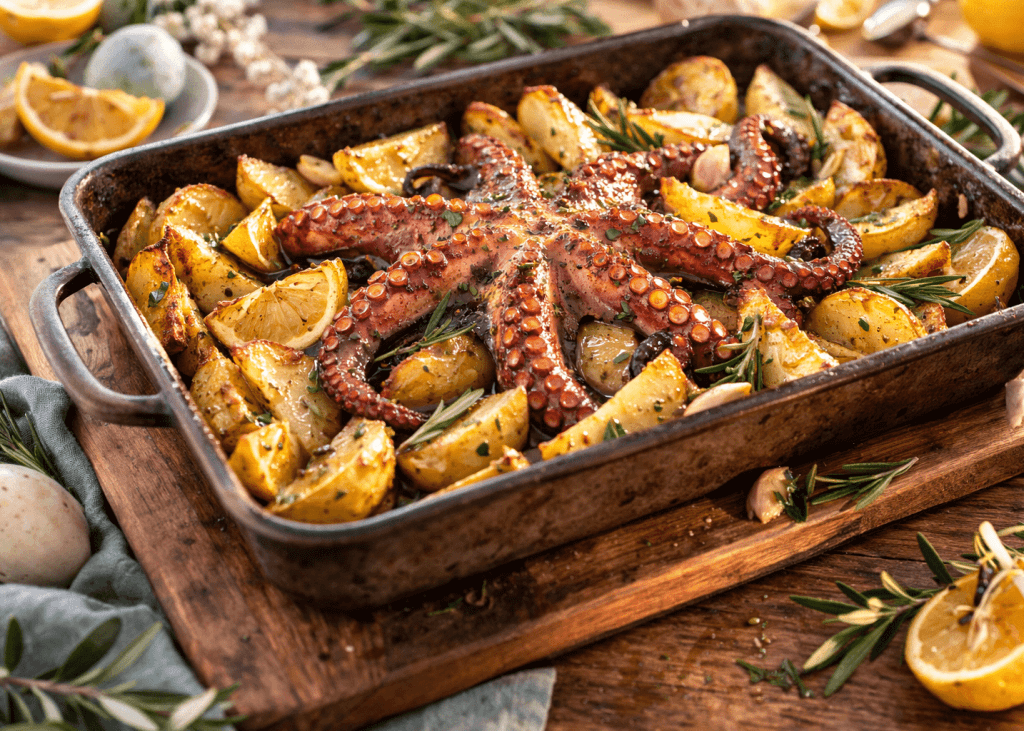 Un secondo piatto di mare che esalta profumi mediterranei con grande naturalezza. Una volta cotto il polpo, ti basterà infornarlo con le patate e spruzzarci sopra un po’ di limone per esaltarne la freschezza. Semplice, scenografico e soprattutto… buonissimo!