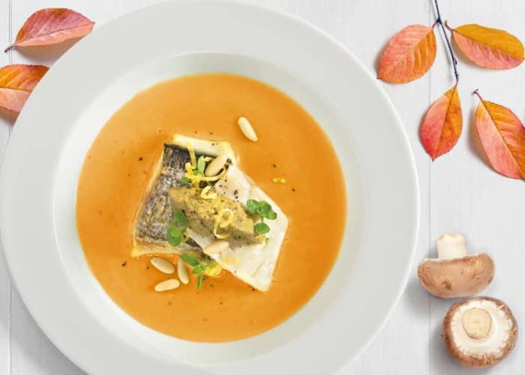 Un abbinamento gustoso che celebra i colori dell’autunno con un tocco di magia: la dolcezza della crema di zucca avvolge l’orata, mentre la tapenade aggiunge carattere e colore.