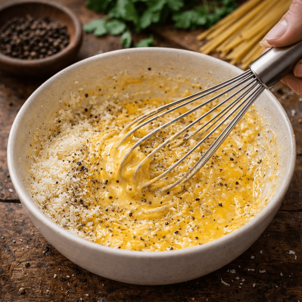 Togli dal fuoco e aggiungi la crema di uova mescolando velocemente con un po’ di acqua di cottura per ottenere la consistenza cremosa.