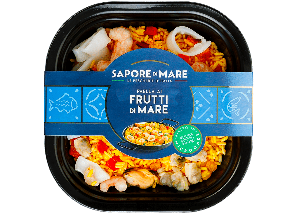 Paella pesce, la ricetta spagnola in una pratica confezione da cuocere al microonde. La nostra paella ai frutti di mare, in versione al microonde, è sicuramente la variante più ricca e apprezzata della tipica pietanza spagnola. La paella surgelata ai frutti di mare è condita con riso, molluschi, crostacei e ortaggi.