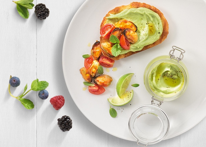 Bruschette con cozze e guacamole